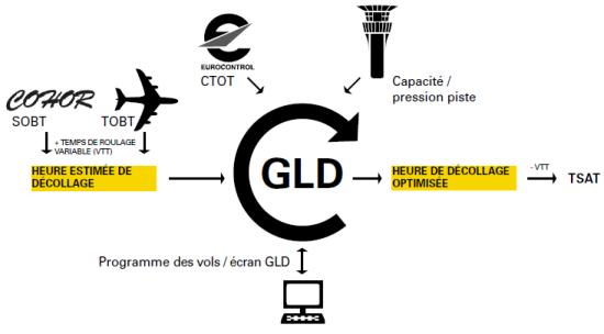Ce système repose sur un principe de fiabilisation des données : les compagnies aériennes ou leurs assistants envoient régulièrement des Estimées Départs (ou Target Off Block Time) à la GLD, mettant à jour l'heure à laquelle l'avion sera prêt à partir.